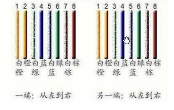 如果要同类型的设备相连接,就要用交叉线,即另一头用B接法,线颜色为:白绿,绿,白橙,蓝,白蓝,橙,白棕,棕。